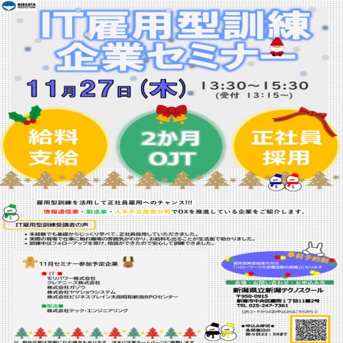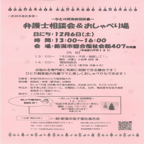 求人情報 2025.10.29 三条市行政書士補助者 2025.10.29 三条市ドローン販売・営業・国家ライセンス教習所・撮影等の業務 2025.10.29 新潟市通所介護 介護スタッフ(中央区鐙) 2025.10.29 新潟市介護保険請求事務員:南区白根 2025.10.29 新潟市訪問介護・介護スタッフ:中央区寄居町 一覧表示 セミナー・交流会・募集 現在予定しているセミナー・交流会・募集はありません。 一覧表示 News 全て イベント センター お知らせ 2025.11.05センター IT雇用型訓練 企業セミナーのご案内 2025.11.05イベント 【新潟市在住の方限定】弁護士相談会&おしゃべり場 2025.10.31イベント 【新潟市在住の方限定】離婚を乗り越える教室 開催のお知らせ 2025.10.30お知らせ 11/11(火)の電話対応について 2025.10.08お知らせ あしなが奨学生募集 2025.10.01イベント 【福祉・介護・健康フェア in新潟】についてのご案内 2025.09.30イベント 【つながりマルシェ】(第6回 みんなでつながろう女性のつどい)のご案内 2025.09.29お知らせ 【グリーフケアセミナー】についてのご案内 2025.09.10お知らせ 介護職員初任者研修についてのお知らせ 2025.08.29お知らせ 入園準備グッズの製作、お手伝いします♬ 2025.08.27センター ひとり親家庭のための巡回相談会(9.10.11.12月)のご案内 2025.08.25センター 【適職診断でおしごとモヤモヤ解消セミナー&おしゃべり会】のご案内 2025.07.31お知らせ 第65回新潟県ひとり親家庭福祉大会を〈新発田市〉で開催いたしました 2025.07.31お知らせ 「広域会員」入会のご案内 2025.07.15センター 【土日・夜間も対応!】出張就業相談(予約制)をご利用ください 一覧表示 2025.10.30お知らせ 11/11(火)の電話対応について 2025.10.08お知らせ あしなが奨学生募集 2025.09.29お知らせ 【グリーフケアセミナー】についてのご案内 2025.09.10お知らせ 介護職員初任者研修についてのお知らせ 2025.08.29お知らせ 入園準備グッズの製作、お手伝いします♬ 2025.07.31お知らせ 第65回新潟県ひとり親家庭福祉大会を〈新発田市〉で開催いたしました 2025.07.31お知らせ 「広域会員」入会のご案内 2025.07.09お知らせ 親権・養育費・親子交流などについてのルールが変わります 2025.01.10お知らせ 賛助会員募集のお知らせ 2024.12.23お知らせ まねきスマイルパスをご利用の皆様へ 2024.04.25お知らせ 企業・団体の皆様へ「自動販売機」設置のお願い 2024.03.28お知らせ 養育費相談・弁護士無料相談の電話番号が変わります 2023.01.18お知らせ 母子会に入りませんか?ひとり親同士で話したり仲間づくりがしたい方へ 2022.09.05お知らせ ジョブマッチにいがた〈求人情報検索〉リニューアルしました! 2021.07.14お知らせ ひとり親ジョブマッチにいがた【求職登録】【求人検索】の手順 一覧表示 2025.11.05イベント 【新潟市在住の方限定】弁護士相談会&おしゃべり場 2025.10.31イベント 【新潟市在住の方限定】離婚を乗り越える教室 開催のお知らせ 2025.10.01イベント 【福祉・介護・健康フェア in新潟】についてのご案内 2025.09.30イベント 【つながりマルシェ】(第6回 みんなでつながろう女性のつどい)のご案内 一覧表示 2025.11.05センター IT雇用型訓練 企業セミナーのご案内 2025.08.27センター ひとり親家庭のための巡回相談会(9.10.11.12月)のご案内 2025.08.25センター 【適職診断でおしごとモヤモヤ解消セミナー&おしゃべり会】のご案内 2025.07.15センター 【土日・夜間も対応!】出張就業相談(予約制)をご利用ください 2025.05.07センター ★大好評★女性用スーツ・バッグの無料レンタル 2025.04.03センター 【夜間相談】のお知らせ 2025.03.31センター 令和7年度『弁護士無料相談』年間スケジュールのご案内 2021.07.30センター Webカメラ・ヘッドセット・スマホスタンド無料レンタル 一覧表示