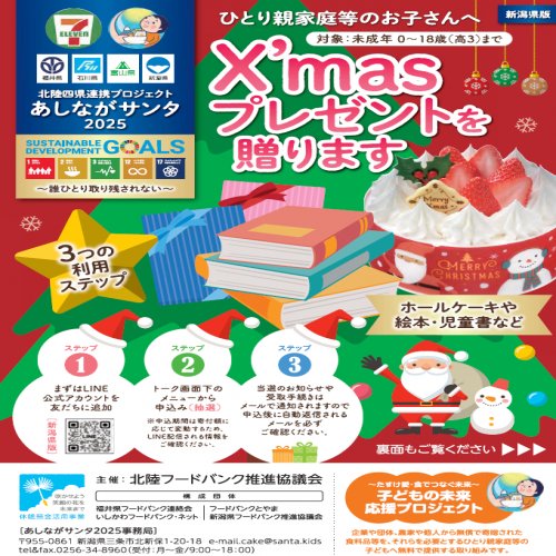 求人情報 2025.11.19 新潟市一般事務(福祉人材センター) 2025.11.18 新潟市事務職(業務・総務・経理) 2025.11.14 新潟市(請)給食調理6H(北区横井/木崎保育園) 2025.11.12 新潟市事務局長 2025.10.29 三条市行政書士補助者 一覧表示 セミナー・交流会・募集 2025.12.14 ハーバリウム制作&おしゃべりカフェin柏崎 一覧表示 News 全て イベント センター お知らせ 2025.11.19イベント 【新潟市在住の方限定】離婚を乗り越える教室 開催のお知らせ 2025.11.19お知らせ あしながサンタX’masケーキ応募のご案内 2025.11.14お知らせ こどもの居場所づくりを支えるクラウドファンディングのお知らせ — 多世代が集う“森×こども食堂”を未来へつなぐ — 2025.11.13お知らせ スキルアップ・併走・就労3つの支援が受けられる!シングルマザー向け「CHEER UPプログラム」のお知らせ 2025.11.12お知らせ <40歳以上のミドル・シニア世代向け>おしごと探しフェアについてのご案内 2025.11.07センター マザーズハローワークについて 2025.11.05センター IT雇用型訓練 企業セミナーのご案内 2025.11.05イベント 【新潟市在住の方限定】弁護士相談会&おしゃべり場 2025.10.08お知らせ あしなが奨学生募集 2025.09.29お知らせ 【グリーフケアセミナー】についてのご案内 2025.09.10お知らせ 介護職員初任者研修についてのお知らせ 2025.08.29お知らせ 入園準備グッズの製作、お手伝いします♬ 2025.08.27センター ひとり親家庭のための巡回相談会(9.10.11.12月)のご案内 2025.08.25センター 【適職診断でおしごとモヤモヤ解消セミナー&おしゃべり会】のご案内 2025.07.31お知らせ 第65回新潟県ひとり親家庭福祉大会を〈新発田市〉で開催いたしました 一覧表示 2025.11.19お知らせ あしながサンタX’masケーキ応募のご案内 2025.11.14お知らせ こどもの居場所づくりを支えるクラウドファンディングのお知らせ — 多世代が集う“森×こども食堂”を未来へつなぐ — 2025.11.13お知らせ スキルアップ・併走・就労3つの支援が受けられる!シングルマザー向け「CHEER UPプログラム」のお知らせ 2025.11.12お知らせ <40歳以上のミドル・シニア世代向け>おしごと探しフェアについてのご案内 2025.10.08お知らせ あしなが奨学生募集 2025.09.29お知らせ 【グリーフケアセミナー】についてのご案内 2025.09.10お知らせ 介護職員初任者研修についてのお知らせ 2025.08.29お知らせ 入園準備グッズの製作、お手伝いします♬ 2025.07.31お知らせ 第65回新潟県ひとり親家庭福祉大会を〈新発田市〉で開催いたしました 2025.07.31お知らせ 「広域会員」入会のご案内 2025.07.09お知らせ 親権・養育費・親子交流などについてのルールが変わります 2025.01.10お知らせ 賛助会員募集のお知らせ 2024.12.23お知らせ まねきスマイルパスをご利用の皆様へ 2024.04.25お知らせ 企業・団体の皆様へ「自動販売機」設置のお願い 2024.03.28お知らせ 養育費相談・弁護士無料相談の電話番号が変わります 一覧表示 2025.11.19イベント 【新潟市在住の方限定】離婚を乗り越える教室 開催のお知らせ 2025.11.05イベント 【新潟市在住の方限定】弁護士相談会&おしゃべり場 一覧表示 2025.11.07センター マザーズハローワークについて 2025.11.05センター IT雇用型訓練 企業セミナーのご案内 2025.08.27センター ひとり親家庭のための巡回相談会(9.10.11.12月)のご案内 2025.08.25センター 【適職診断でおしごとモヤモヤ解消セミナー&おしゃべり会】のご案内 2025.07.15センター 【土日・夜間も対応!】出張就業相談(予約制)をご利用ください 2025.05.07センター ★大好評★女性用スーツ・バッグの無料レンタル 2025.04.03センター 【夜間相談】のお知らせ 2025.03.31センター 令和7年度『弁護士無料相談』年間スケジュールのご案内 2021.07.30センター Webカメラ・ヘッドセット・スマホスタンド無料レンタル 一覧表示