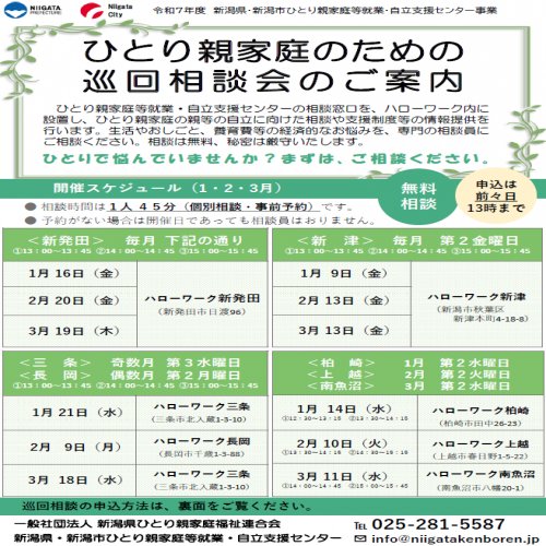 求人情報 2025.12.26 新潟市上越新幹線・新潟在来線の軌道工【中高年層限定求人】 2025.12.26 新潟市上越新幹線及び新潟在来線レールメンテナンス 経験不問 2025.12.19 新潟市一般事務 2025.12.19 新潟市一般事務 2025.12.16 新発田市月岡ブルワリー ビール醸造パートスタッフ 一覧表示 セミナー・交流会・募集 現在予定しているセミナー・交流会・募集はありません。 一覧表示 News 全て イベント センター お知らせ 2025.12.23お知らせ 東京大学で開催される「伊東豊雄 こども国際建築ワークショップ in 東京大学」のご案内 2025.12.17センター ひとり親家庭のための巡回相談会(1~3月)のご案内 2025.12.16お知らせ 父母の離婚後の子の養育に関する民法等改正法、ひとり親家庭等支援施策のご案内 2025.12.11お知らせ 【新潟市立中学校リユース制服頒布会】のご案内 2025.11.14お知らせ こどもの居場所づくりを支えるクラウドファンディングのお知らせ — 多世代が集う“森×こども食堂”を未来へつなぐ — 2025.11.13お知らせ スキルアップ・併走・就労3つの支援が受けられる!シングルマザー向け「CHEER UPプログラム」のお知らせ 2025.11.07センター マザーズハローワークについて 2025.10.08お知らせ あしなが奨学生募集 2025.09.10お知らせ 介護職員初任者研修についてのお知らせ 2025.08.29お知らせ 入園準備グッズの製作、お手伝いします♬ 2025.07.31お知らせ 第65回新潟県ひとり親家庭福祉大会を〈新発田市〉で開催いたしました 2025.07.31お知らせ 「広域会員」入会のご案内 2025.07.15センター 【土日・夜間も対応!】出張就業相談(予約制)をご利用ください 2025.07.09お知らせ 親権・養育費・親子交流などについてのルールが変わります 2025.05.07センター ★大好評★女性用スーツ・バッグの無料レンタル 一覧表示 2025.12.23お知らせ 東京大学で開催される「伊東豊雄 こども国際建築ワークショップ in 東京大学」のご案内 2025.12.16お知らせ 父母の離婚後の子の養育に関する民法等改正法、ひとり親家庭等支援施策のご案内 2025.12.11お知らせ 【新潟市立中学校リユース制服頒布会】のご案内 2025.11.14お知らせ こどもの居場所づくりを支えるクラウドファンディングのお知らせ — 多世代が集う“森×こども食堂”を未来へつなぐ — 2025.11.13お知らせ スキルアップ・併走・就労3つの支援が受けられる!シングルマザー向け「CHEER UPプログラム」のお知らせ 2025.10.08お知らせ あしなが奨学生募集 2025.09.10お知らせ 介護職員初任者研修についてのお知らせ 2025.08.29お知らせ 入園準備グッズの製作、お手伝いします♬ 2025.07.31お知らせ 第65回新潟県ひとり親家庭福祉大会を〈新発田市〉で開催いたしました 2025.07.31お知らせ 「広域会員」入会のご案内 2025.07.09お知らせ 親権・養育費・親子交流などについてのルールが変わります 2025.01.10お知らせ 賛助会員募集のお知らせ 2024.12.23お知らせ まねきスマイルパスをご利用の皆様へ 2024.04.25お知らせ 企業・団体の皆様へ「自動販売機」設置のお願い 2024.03.28お知らせ 養育費相談・弁護士無料相談の電話番号が変わります 一覧表示 一覧表示 2025.12.17センター ひとり親家庭のための巡回相談会(1~3月)のご案内 2025.11.07センター マザーズハローワークについて 2025.07.15センター 【土日・夜間も対応!】出張就業相談(予約制)をご利用ください 2025.05.07センター ★大好評★女性用スーツ・バッグの無料レンタル 2025.04.03センター 【夜間相談】のお知らせ 2025.03.31センター 令和7年度『弁護士無料相談』年間スケジュールのご案内 2021.07.30センター Webカメラ・ヘッドセット・スマホスタンド無料レンタル 一覧表示