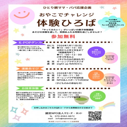 求人情報 2026.01.16 新潟市社内の清掃、商品の荷受け、出荷業務 2026.01.07 湯沢町温泉旅館の【調理部】 2026.01.06 加茂市看護師・准看護師 2025.12.26 新潟市上越新幹線・新潟在来線の軌道工【中高年層限定求人】 2025.12.26 新潟市上越新幹線及び新潟在来線レールメンテナンス 経験不問 一覧表示 セミナー・交流会・募集 現在予定しているセミナー・交流会・募集はありません。 一覧表示 News 全て イベント センター お知らせ 2026.01.13センター 「適職診断でおしごとモヤモヤ解消セミナー」アーカイブ動画のご案内 2026.01.09イベント 【新潟市在住の方限定】ライフプラン相談会&おしゃべり場のご案内 2026.01.06イベント 上越のイベントご案内 2025.12.23お知らせ 東京大学で開催される「伊東豊雄 こども国際建築ワークショップ in 東京大学」のご案内 2025.12.17センター ひとり親家庭のための巡回相談会(1~3月)のご案内 2025.12.16お知らせ 父母の離婚後の子の養育に関する民法等改正法、ひとり親家庭等支援施策のご案内 2025.12.11お知らせ 【新潟市立中学校リユース制服頒布会】のご案内 2025.11.13お知らせ スキルアップ・併走・就労3つの支援が受けられる!シングルマザー向け「CHEER UPプログラム」のお知らせ 2025.11.07センター マザーズハローワークについて 2025.09.10お知らせ 介護職員初任者研修についてのお知らせ 2025.08.29お知らせ 入園準備グッズの製作、お手伝いします♬ 2025.07.31お知らせ 第65回新潟県ひとり親家庭福祉大会を〈新発田市〉で開催いたしました 2025.07.31お知らせ 「広域会員」入会のご案内 2025.07.15センター 【土日・夜間も対応!】出張就業相談(予約制)をご利用ください 2025.07.09お知らせ 親権・養育費・親子交流などについてのルールが変わります 一覧表示 2025.12.23お知らせ 東京大学で開催される「伊東豊雄 こども国際建築ワークショップ in 東京大学」のご案内 2025.12.16お知らせ 父母の離婚後の子の養育に関する民法等改正法、ひとり親家庭等支援施策のご案内 2025.12.11お知らせ 【新潟市立中学校リユース制服頒布会】のご案内 2025.11.13お知らせ スキルアップ・併走・就労3つの支援が受けられる!シングルマザー向け「CHEER UPプログラム」のお知らせ 2025.09.10お知らせ 介護職員初任者研修についてのお知らせ 2025.08.29お知らせ 入園準備グッズの製作、お手伝いします♬ 2025.07.31お知らせ 第65回新潟県ひとり親家庭福祉大会を〈新発田市〉で開催いたしました 2025.07.31お知らせ 「広域会員」入会のご案内 2025.07.09お知らせ 親権・養育費・親子交流などについてのルールが変わります 2025.01.10お知らせ 賛助会員募集のお知らせ 2024.12.23お知らせ まねきスマイルパスをご利用の皆様へ 2024.04.25お知らせ 企業・団体の皆様へ「自動販売機」設置のお願い 2024.03.28お知らせ 養育費相談・弁護士無料相談の電話番号が変わります 2023.01.18お知らせ 母子会に入りませんか?ひとり親同士で話したり仲間づくりがしたい方へ 2022.09.05お知らせ ジョブマッチにいがた〈求人情報検索〉リニューアルしました! 一覧表示 2026.01.09イベント 【新潟市在住の方限定】ライフプラン相談会&おしゃべり場のご案内 2026.01.06イベント 上越のイベントご案内 一覧表示 2026.01.13センター 「適職診断でおしごとモヤモヤ解消セミナー」アーカイブ動画のご案内 2025.12.17センター ひとり親家庭のための巡回相談会(1~3月)のご案内 2025.11.07センター マザーズハローワークについて 2025.07.15センター 【土日・夜間も対応!】出張就業相談(予約制)をご利用ください 2025.05.07センター ★大好評★女性用スーツ・バッグの無料レンタル 2025.04.03センター 【夜間相談】のお知らせ 2025.03.31センター 令和7年度『弁護士無料相談』年間スケジュールのご案内 2021.07.30センター Webカメラ・ヘッドセット・スマホスタンド無料レンタル 一覧表示