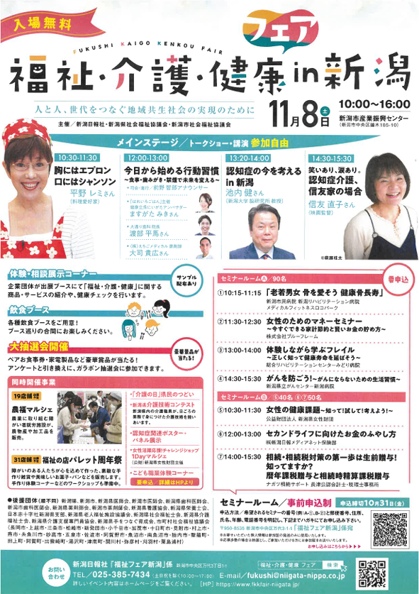 【福祉・介護・健康フェア in新潟】についてのご案内 2025.10.01 イベント 【福祉・介護・健康フェア in新潟】についてのご案内🌼 平野レミさんのトークショー、飲食ブースやマルシェなど楽しい企画が盛りだくさん!お子様も一緒に楽しめるイベントです😁 日時:11月8日(土) 10:00〜16:00 会場:新潟市産業振興センター(新潟市中央区鐘木185-10) 詳しくはコチラ💁♀️https://www.fkkfair-niigata.jp/ 【お問合せ先】 新潟日報社「福祉フェアin新潟」係 TEL:025-385-7434(土日祝を除く10:00~17:00)