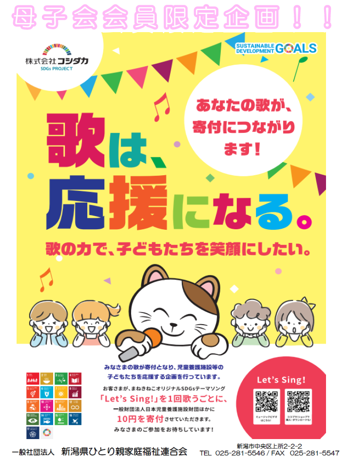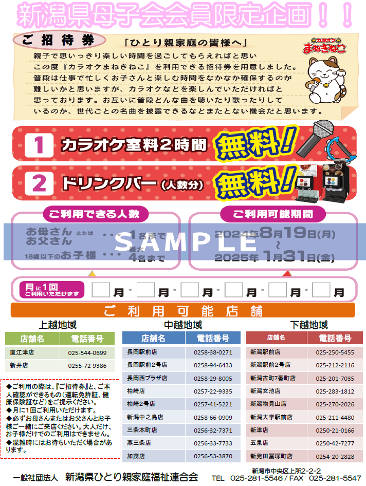 内容 | 【注意】 新潟市母子会会員の方の申込受付は終了しました。 【新潟市以外の各地域母子会会員・広域会員の方限定!!】 株式会社コシダカ様のご厚意により、『カラオケまねきねこ』でご利用可能な招待券をプレゼントいたします。 各地域母子会会員・広域会員の方限定ですが、新たに入会いただいた方も対象となります! 新たに母子会へ入会希望の方はHPの市町村母子会一覧より、お住い地域の各母子会へご連絡お願いいたします。 また、お住まいの市町村に母子会がない場合は、新潟県ひとり親家庭福祉連合会【広域会員】としてご入会いただけます。 ◆新潟市在住で母子会入会希望の方は下記までご連絡お願いいたします。 一般財団法人 新潟市母子福祉連合会 TEL/FAX:025-243-4380 ◆各地域母子会の会員の方は、こちらのフォームからではなく母子会を通じてお申し込みください。 対象者:ひとり親家庭の家族(親1名 と18歳以下のお子様(最大4名まで)) 利用期間:2025年11月1日(土)~2026年4月30日(木) (各月1回利用可能) 利用内容:2時間分の室料と人数分のドリンクバーが無料 利用可能店舗:新潟県内のカラオケまねきねこ店舗 応募〆切:2025年10月28日(火) 16:00まで ・会員であることが確認できましたら、各地域母子会より随時招待券を郵送します。 ・応募は1家庭1回限りとします。お送りするハガキ1枚で到着して以降2026年4月末まで各月1回ご利用いただけます。 ・利用方法など詳しくは招待券をご覧ください。 (住所氏名等の情報は(株)コシダカ様に提供することはありません) |