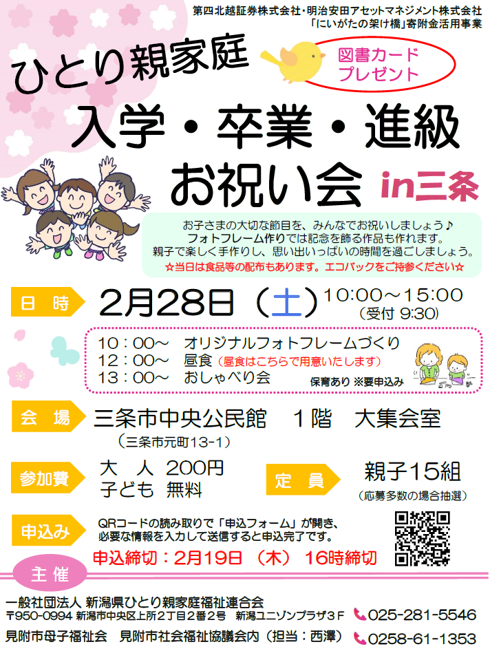 | セミナー・交流会名 | (三条)ひとり親家庭「入学・卒業・進級お祝い会」 |