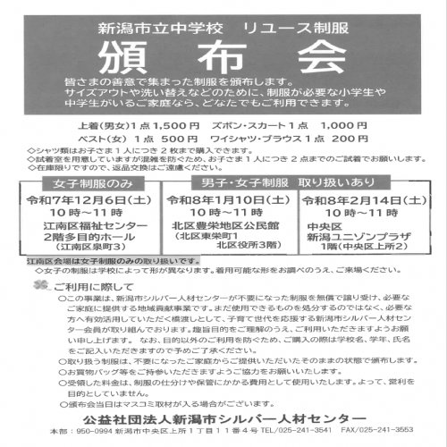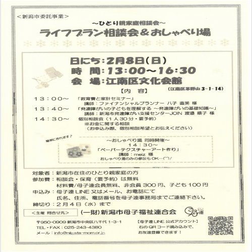 求人情報 2026.02.02 三条市行政書士または行政書士補助 2026.01.23 新潟市事務 2026.01.16 新潟市社内の清掃、商品の荷受け、出荷業務 2026.01.07 湯沢町温泉旅館の【調理部】 2026.01.06 加茂市看護師・准看護師 一覧表示 セミナー・交流会・募集 2026.02.28 (三条)ひとり親家庭「入学・卒業・進級お祝い会」 一覧表示 News 全て イベント センター お知らせ 2026.02.02お知らせ 2026年度「夢を応援基金『ひとり親家庭支援奨学金制度』」募集について 2026.01.23お知らせ 【新潟市立中学校リユース制服頒布会】のご案内 2026.01.13センター 「適職診断でおしごとモヤモヤ解消セミナー」アーカイブ動画のご案内 2026.01.09イベント 【新潟市在住の方限定】ライフプラン相談会&おしゃべり場のご案内 2025.12.17センター ひとり親家庭のための巡回相談会(1~3月)のご案内 2025.12.16お知らせ 父母の離婚後の子の養育に関する民法等改正法、ひとり親家庭等支援施策のご案内 2025.11.07センター マザーズハローワークについて 2025.09.10お知らせ 介護職員初任者研修についてのお知らせ 2025.08.29お知らせ 入園準備グッズの製作、お手伝いします♬ 2025.07.31お知らせ 第65回新潟県ひとり親家庭福祉大会を〈新発田市〉で開催いたしました 2025.07.31お知らせ 「広域会員」入会のご案内 2025.07.15センター 【土日・夜間も対応!】出張就業相談(予約制)をご利用ください 2025.07.09お知らせ 親権・養育費・親子交流などについてのルールが変わります 2025.05.07センター ★大好評★女性用スーツ・バッグの無料レンタル 2025.04.03センター 【夜間相談】のお知らせ 一覧表示 2026.02.02お知らせ 2026年度「夢を応援基金『ひとり親家庭支援奨学金制度』」募集について 2026.01.23お知らせ 【新潟市立中学校リユース制服頒布会】のご案内 2025.12.16お知らせ 父母の離婚後の子の養育に関する民法等改正法、ひとり親家庭等支援施策のご案内 2025.09.10お知らせ 介護職員初任者研修についてのお知らせ 2025.08.29お知らせ 入園準備グッズの製作、お手伝いします♬ 2025.07.31お知らせ 第65回新潟県ひとり親家庭福祉大会を〈新発田市〉で開催いたしました 2025.07.31お知らせ 「広域会員」入会のご案内 2025.07.09お知らせ 親権・養育費・親子交流などについてのルールが変わります 2025.01.10お知らせ 賛助会員募集のお知らせ 2024.12.23お知らせ まねきスマイルパスをご利用の皆様へ 2024.04.25お知らせ 企業・団体の皆様へ「自動販売機」設置のお願い 2024.03.28お知らせ 養育費相談・弁護士無料相談の電話番号が変わります 2023.01.18お知らせ 母子会に入りませんか?ひとり親同士で話したり仲間づくりがしたい方へ 2022.09.05お知らせ ジョブマッチにいがた〈求人情報検索〉リニューアルしました! 2021.07.14お知らせ ひとり親ジョブマッチにいがた【求職登録】【求人検索】の手順 一覧表示 2026.01.09イベント 【新潟市在住の方限定】ライフプラン相談会&おしゃべり場のご案内 一覧表示 2026.01.13センター 「適職診断でおしごとモヤモヤ解消セミナー」アーカイブ動画のご案内 2025.12.17センター ひとり親家庭のための巡回相談会(1~3月)のご案内 2025.11.07センター マザーズハローワークについて 2025.07.15センター 【土日・夜間も対応!】出張就業相談(予約制)をご利用ください 2025.05.07センター ★大好評★女性用スーツ・バッグの無料レンタル 2025.04.03センター 【夜間相談】のお知らせ 2025.03.31センター 令和7年度『弁護士無料相談』年間スケジュールのご案内 2021.07.30センター Webカメラ・ヘッドセット・スマホスタンド無料レンタル 一覧表示