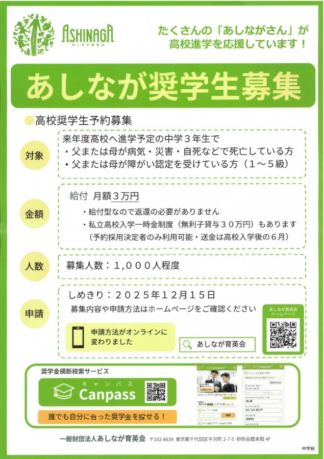 <申請資格>保護者(父または母など)が病気や災害、自死などで死亡または保護者が1級から5級の障がい認定を受けていけ、経済的な援助を必要としている中学3年生。