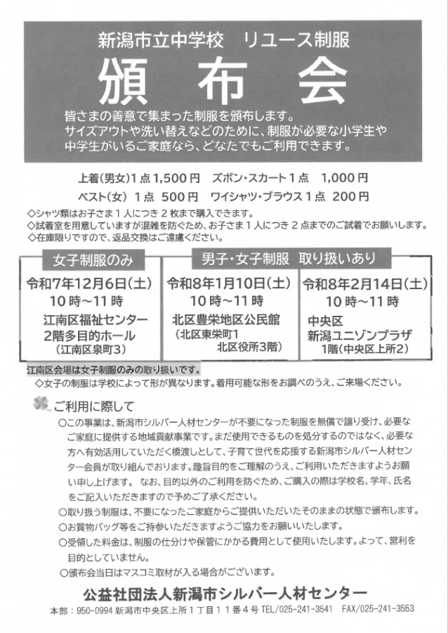 🌸新潟市立中学校 リユース制服 頒布会のご案内🌸