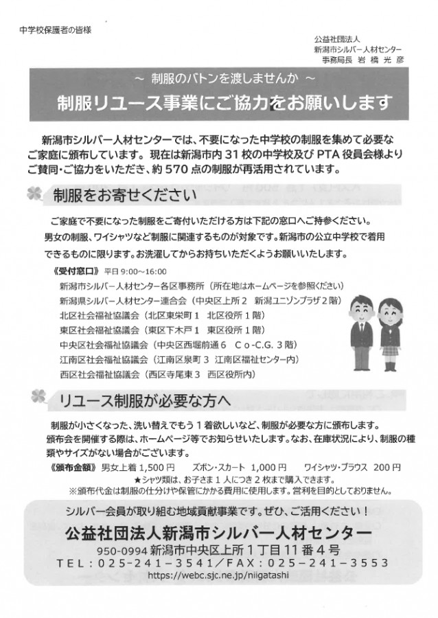 【新潟市立中学校リユース制服頒布会】のご案内