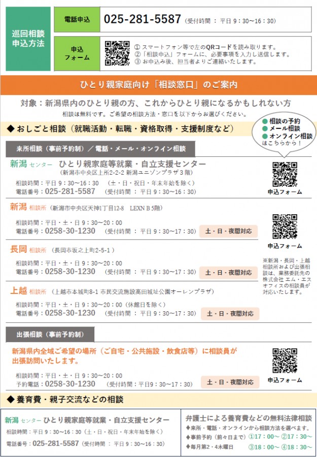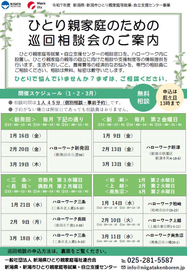 ひとり親家庭のための巡回相談会(1~3月)のご案内 2025.12.17 センター ハローワーク内に自立支援センターの相談窓口を設置しています😊 ひとり親家庭の親等の自立に向けた支援制度のご案内や、各種ご相談を受け付けています。 生活のこと、お仕事のこと、養育費など経済的なお悩みについて、専門の相談員が対応いたします。 相談は無料、秘密は厳守いたします。 巡回相談会のお申込はこちらから