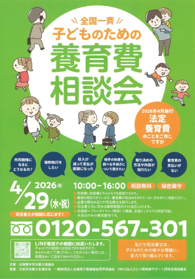 「子どものための養育費相談会」を開催します。 2026.04.15 センター 「子どものための養育費相談会」を開催します。 養育費の取り決めや支払い、強制執行などについて、専門家に無料で相談できます。 📅 2026年4月29日(水・祝) 🕙 10:00〜16:00 💰 相談無料/秘密厳守 📞 0120-567-301(全国対応・フリーダイヤル) ひとりで悩まず、まずはご相談ください。 詳しくはチラシをご参照ください。